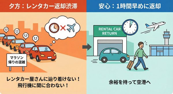 「夕方にレンタカーを返して石垣空港へ!」という計画の方は要注意! マラソン帰りの人で、夕方の離島ターミナル周辺は再び道路が混み合います。「レンタカー屋さんに辿り着けない!」「飛行機に間に合わない!」なんてことにならないように早めに行動しましょう!